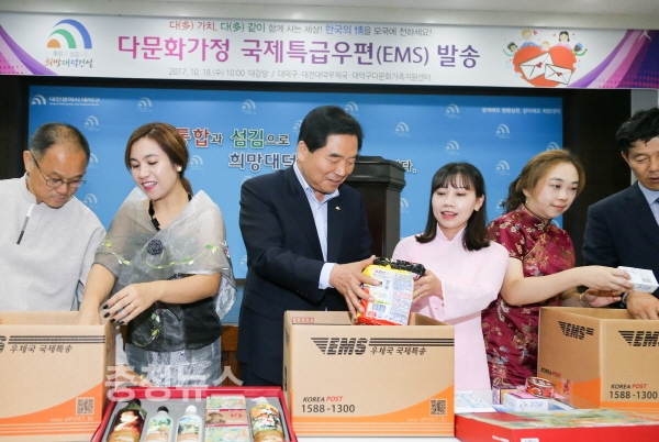대전 대덕구(구청장 박수범)는 18일 구청 대강당에서 다문화가정 60세대와 다문화가정 국제특급우편요금 지원 업무협약을 맺은 대덕구, 대전대덕우체국(국장 정재준), 대덕구다문화가족지원센터(센터장 김도율) 3곳이 함께 모여 국제특급우편(EMS) 발송 행사를 가졌다.