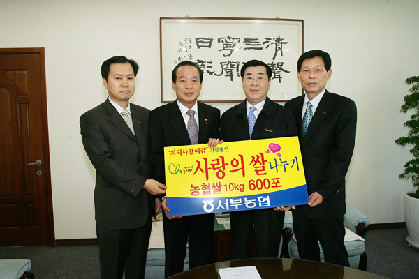 26일에는 서부농협 본점(조합장 임헌성)에서 사랑의 쌀 600포(시가 1,380천원 상당)를 지정 기탁해 지역사회의 기부문화 확산을 통한 따뜻한 사회분위기 조성에 앞장서고 있다