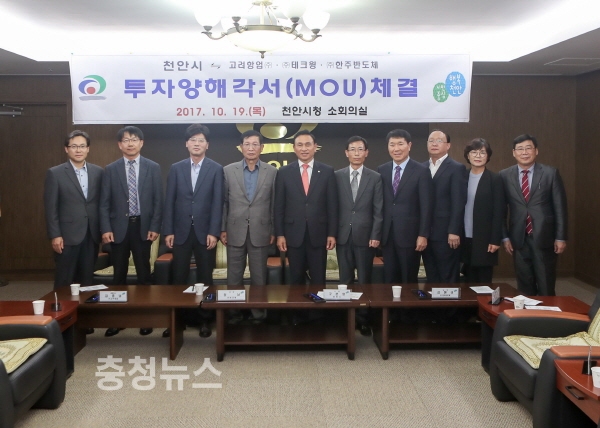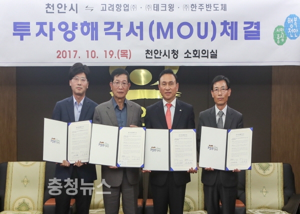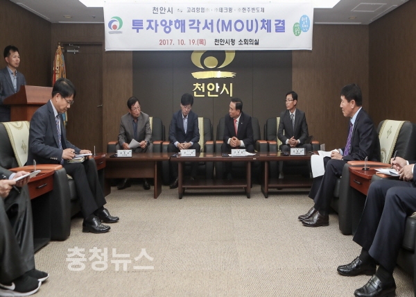 충남 천안시는 19일 시청 소회의실에서 첨단우량 기업 3곳과 합동으로 투자양해각서를 체결했다.