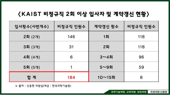국회 과학기술정보방송통신위원회 소속 신용현 의원(국민의당)이 KAIST로부터 받은 ‘비정규직 재입사 및 계약갱신 현황’ 자료에 따르면, KAIST 비정규직 중 수 차례의 재입사를 통해 사번이 2개 이상인 직원이 184명에 달하고, 재직기간 동안 계약갱신을 3~15회 한 직원도 163명에 이르는 것으로 확인되었다.