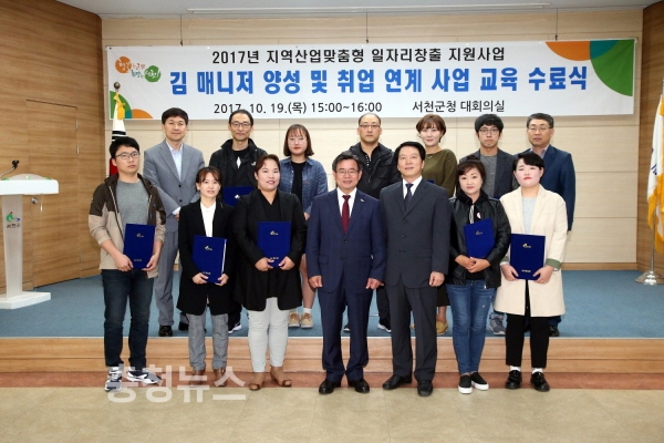 충남 서천군(군수 노박래)은 지난 19일 군청 회의실에서 지역산업맞춤형 일자리창출지원사업으로 추진한 ‘김 매니저 양성 및 취업 연계 사업’ 교육생 수료식을 가졌다.