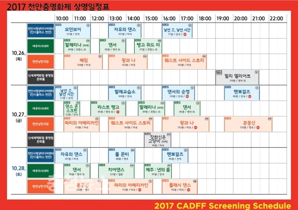 ‘2017 천안춤영화제’가 이달 26일부터 28일까지 3일간 비채 등 4개 상영관에서 빌리엘리어트 등 24편의 영화로 관객들을 만난다.