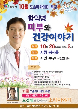 충남 천안시는 이달 26일 시청 봉서홀에서 피부과 전문의 함익병 강사를 초청해 ‘피부와 건강이야기’라는 주제로 10월 도솔아카데미 특강을 진행한다.