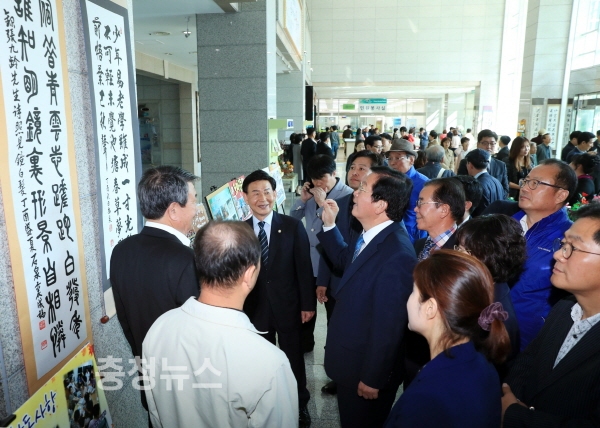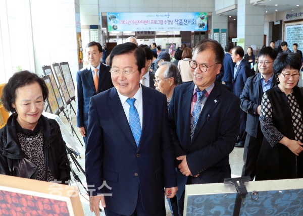 주민자치센터 프로그램 수강생 작품전시회를 둘러보고 있는 장종태 구청장