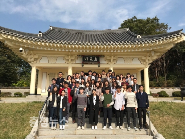 충의사에서 예산군 신규공무원들이 문화관광해설사로부터 해설을 듣고 있다