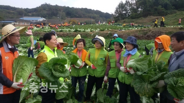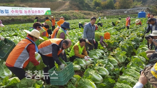 이날 일손돕기에는 김병원 농협중앙회장과 전국에서 모인 범 농협 임직원과 (사)고향을 생각하는 주부들의 모임 회원 등 320여 명이 참석해 한마음으로 가을배추 수확에 구슬땀을 흘렸다.