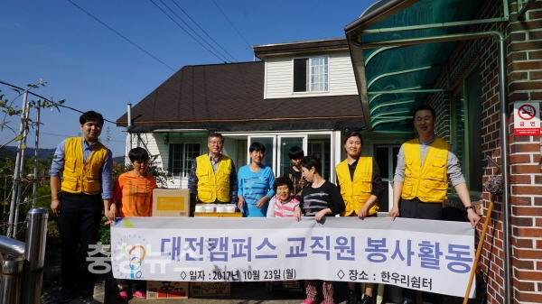 대전캠퍼스 교직원 10여 명이 실시한 이번 봉사활동은 다가올 동절기를 맞아 지난 3년간 지속적으로 후원 중에 있는 한우리쉼터에 20만원 상당의 생필품 전달, 환경정화 활동, 시설 수리 등을 실시했다.
