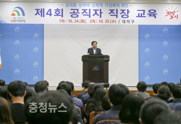대전 대덕구(구청장 박수범)는 지난 24일과 25일 양일간 구청 대강당에서 대전과학기술대학교 김윤이 교수를 초청해 직원 500명을 대상으로 직장 내 성희롱․ 성매매․ 성폭력․가정폭력 등 4대 폭력예방 통합교육을 실시했다.