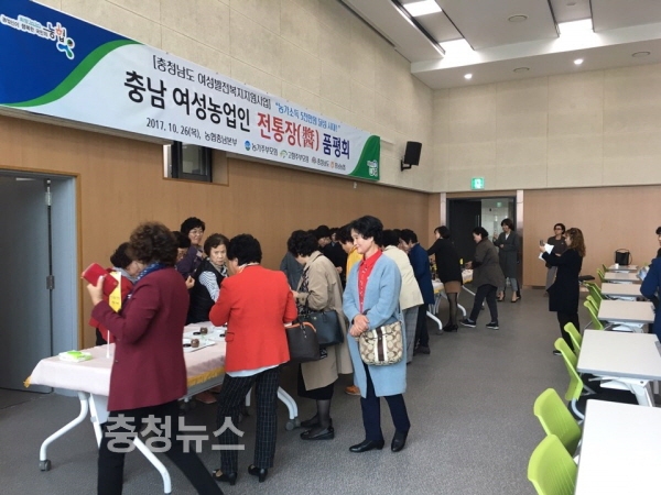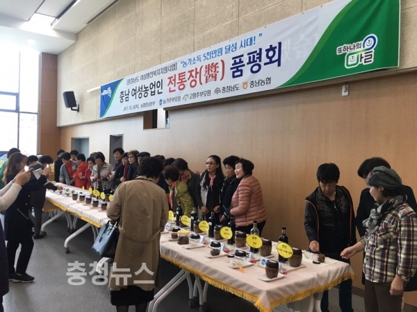 농협 충남본부(본부장 유찬형)는 농가주부모임충남연합회(회장 김금자)와 26일 홍성군 홍북면 소재 충남본부 회의실에서 충남관내 여성농업인 150여명이 참가한 가운데 농촌여성 농가소득 증대사업 일환으로 실시한 전통장(醬) 품평회를 가졌다.