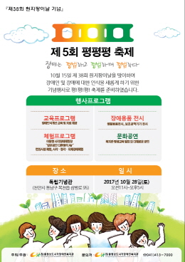 충청남도시각장애인복지관(관장 김병환)은 이달 28일 천안 독립기념관에서 평!평!평!(장애는 평범하고, 평범하며, 평범하다) 축제를 개최한다고 밝혔다.