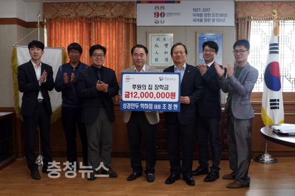 이날 전달식에서 성경만두 학하점 조정현 대표는 송하영 총장에게 한밭대 학생들을 위한 장학금으로 써 달라며 대학발전기금 1200만원 기부를 약정했다.