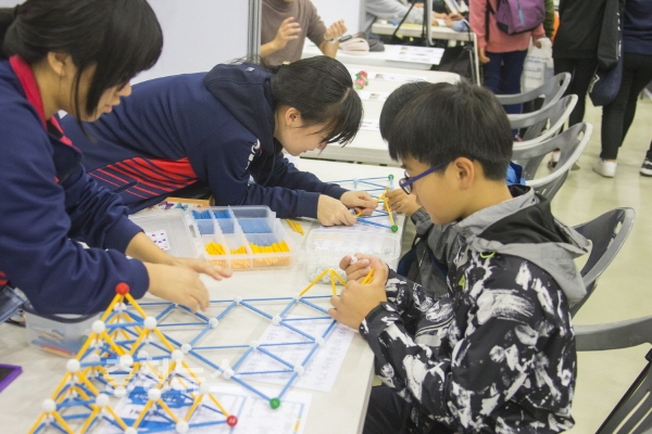 수학체험부스에서는 ▲아름다운 수 ▲곡선의 세계 ▲평면도형의 세계 ▲입체도형의 세계 ▲놀이·샐활 속의 수학 등 다양한 주제로 수학교구를 활용한 체험학습이 운영됐다.