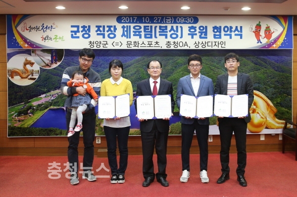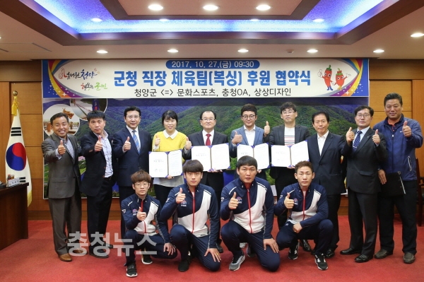 충남 청양군청 복싱팀이 관내 업체로부터 든든한 후원을 받게 됐다. 군에 따르면 27일 군청 상황실에서 청양군 소재 업체인 문화스포츠, 충청OA, 상상디자인 각 대표와 복싱팀 선수 등이 참석한 가운데 후원 협약식을 가졌다.