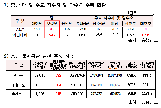 이 의원실에 따르면 이번 가뭄 피해에 대비한 충남도의 대책을 보면 지하수를 상수도로 사용 중인 가구에서 수량부족이 발생해 민방위급수시설 등 비상급수원을 확보했다. 또 10개의 정수장 중 6개소 정수장의 수량이 부족해 남관·병천·온양1동 지역은 대청댐으로부터, 창동·덕산지역은 보령댐으로부터 급수를 확보했고 유구지역은 민방위급수시설로 부족한 수량을 확보했다.