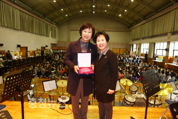 강숙자 대전 유성구의회 의원이 27일 외삼초등학교 강당에서 열린 외삼 방과후학교 발표회에서 안치순 교장으로부터 감사패를 받았다.