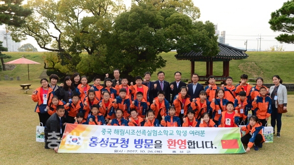충남 홍성군은 지난 26일 오후 중국 해림시 조선족실험소학교(교장 장강철) 학생 32명과 교사 5명 등 37명이 군청을 방문해 환영행사를 가졌다고 밝혔다.