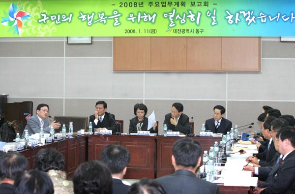 대전시 동구(구청장 이장우)가 올 한해 구정운영의 기본 틀 마련을 위한 2008년도 주요업무계획 보고회를 개최했다.