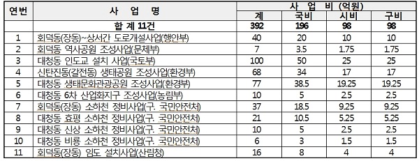 이번에 반영된 사업은 장동-상서 간도로개설사업을 비롯해 회덕동 역사공원 조성, 대청동 인도교 설치, 신탄진동(갈전동) 생태공원 및 대청동 생태문화관광공원 조성, 대청동 6차 산업화지구 조성 등이다. 또한 장동 소하천 및 대청동 효평·신상·비룡 소하천 정비, 장동 임도 설치사업 등도 포함됐다.