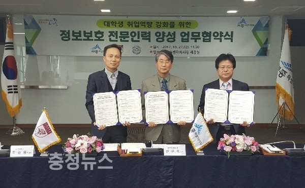 세종특별자치시(시장 이춘희)는 27일 청사 내 5층 세종실에서 고려대학교 세종캠퍼스, 홍익대 세종캠퍼스와 정보보호 전문인력 양성을 위한 업무협약을 체결했다.