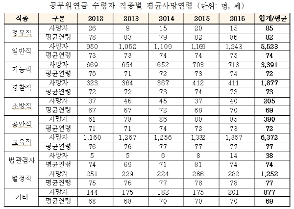 소방직의 경우 퇴직후 공무원연금을 평균 10년도 채 받지 못하고 있었다. 이어 기능직·공안직 72세(3,391명, 390명 각 사망), 경찰직 73세(1,877명 사망), 일반직과 법관·검사 74세(5,523명, 38명 각 사망), 교육직·별정직 77세(6,372명, 1,252명 각 사망), 정무직 82세(85명 사망) 순이었다.
