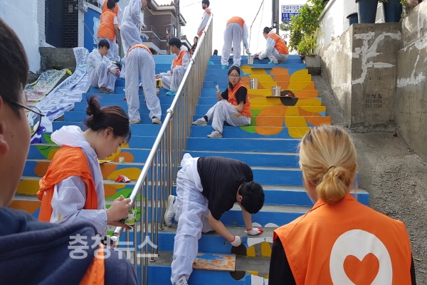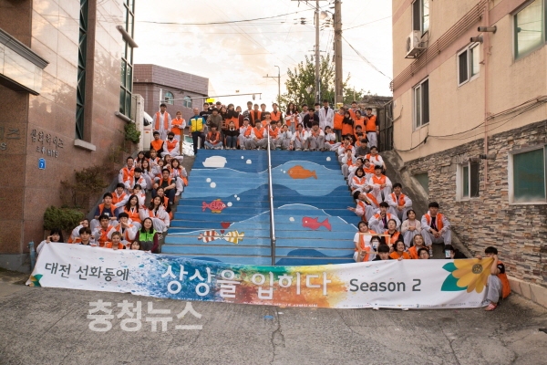 T&G충남본부(본부장 이흥주) 상상유니브 대학생봉사단인 ‘상상발룬티어’는 지난 28일 대전 중구 선화동 일원에서 일반 대학생 봉사자 등 100명이 함께 참여해 ‘상상을 입히다 시즌2, 대전 선화동의 계단을 밝히다.’를 진행했다.