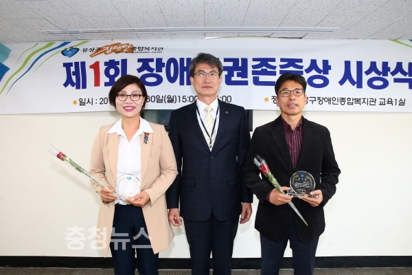 유성구의회 김양경 의원과 노승연 의원이 30일 유성구 장애인복지관에서 열린 ‘제1회 장애인권존중상 시상식‘에서 박병규 관장으로부터 감사패를 받았다.