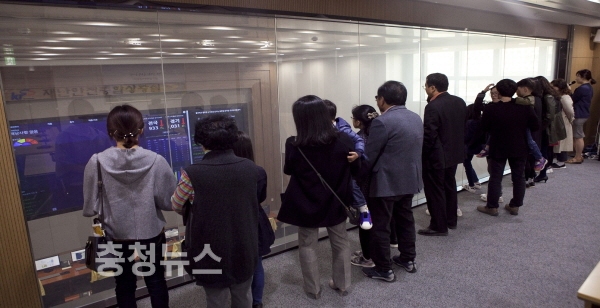 수상자 및 가족들이 공사 재난안전종합상황실을 방문, ICT 기반 스마트 물관리 시스템에 대한 설명을 듣고 있다