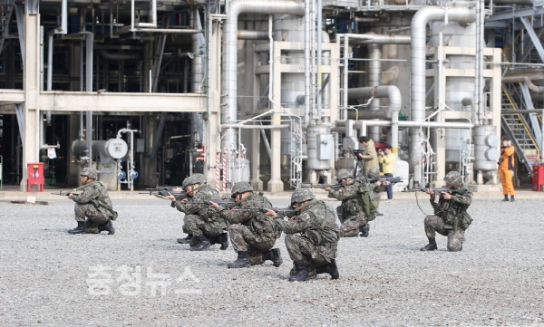먼저 사회에 불만을 품은 테러리스트가 한화토탈 공장에 폭발물을 설치하고 폭파시키면서 유해화학물질 유출된 상황이 발생된 것을 가정해 훈련이 시작됐다.