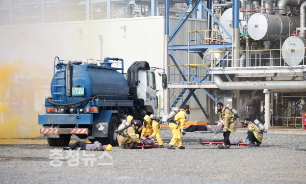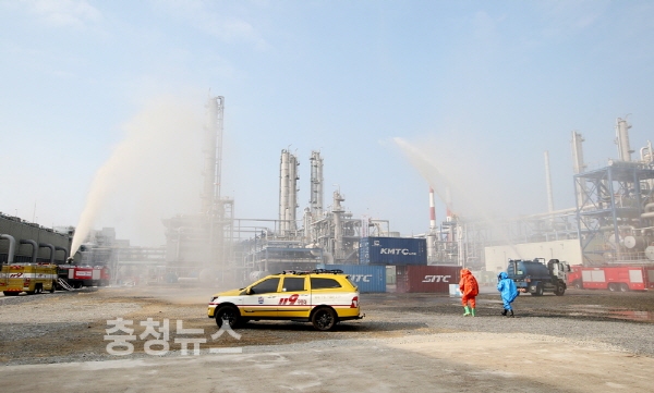 충남 서산시가 2일 대산석유화학단지에 위치한 한화토탈에서 유해화학물질 유출사고 실행기반훈련을 실시했다.