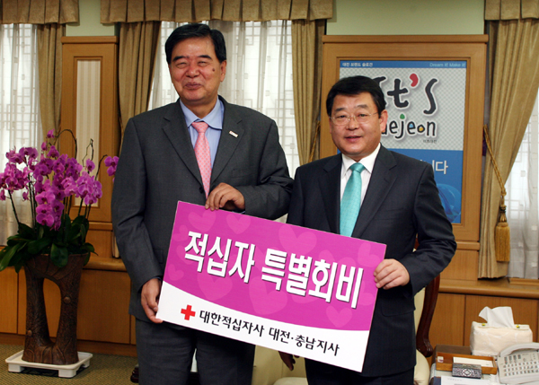 박성효 대전시장은 2008.적십자회비 첫날인 21일 대한적십자사 대전충남지사 박건영 회장의 예방을 받고 200만원의 특별회비 전달과 함께  올해 목표액을 모금할수 있도록 적극적인 협조를 약속하고 태안 원유유출사고 피해민들을 위한 적십자사의 각별한 관심을 당부했다.