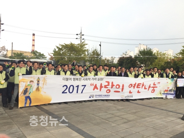 한국철도시설공단은 3일 임직원들과 연탄은행 관계자 110여명이 참석한 가운데 ‘2017 사랑의 연탄 나눔’ 행사를 갖고 연탄 3만장과 라면 60박스를 대전연탄은행에 기증한다고 밝혔다.