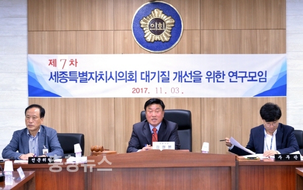세종시의회(의장 고준일) “대기질 개선을 위한 연구모임(대표 김정봉 의원)”은 3일 오전 의회운영위원회 회의실에서 제7차 간담회를 개최해 2017년도 대기질 개선을 위한 연구모임 활동결과를 보고하는 뜻깊은 시간을 가졌다.