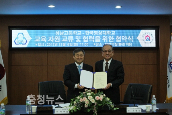 한국영상대학교(총장 유재원)는 6일 본관 대회의실에서 세종시 소재 성남고등학교(교장 박백범)와 교육의 효율성과 질적 향상을 위해 교류협약을 체결했다.