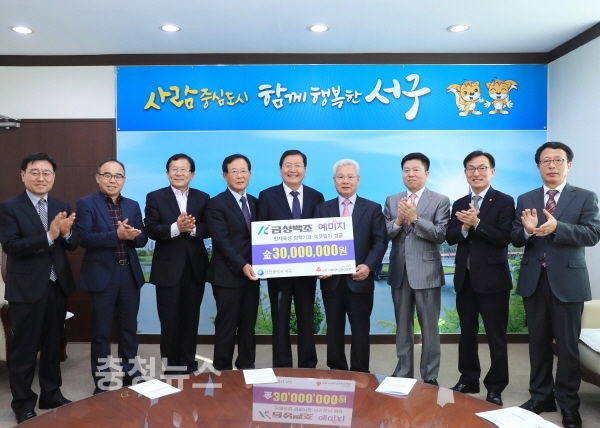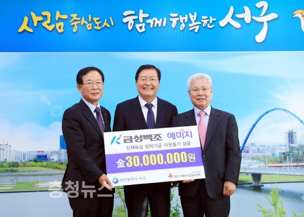 대전 서구(구청장 장종태)는 6일 구청 다목적실에서 ㈜금성백조주택(대표이사 정성욱)으로부터 장학금 및 이웃돕기 성금으로 3천만 원을 전달받았다고 밝혔다.