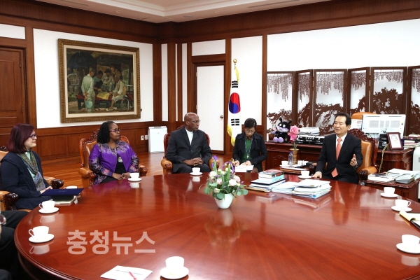 정세균 국회의장은 7일 오후 3시 국회의장실에서 ‘노근리 사건’사과 결의문 전달을 위해 국회를 방문한 미국 장로교 대표단의 예방을 받았다.
