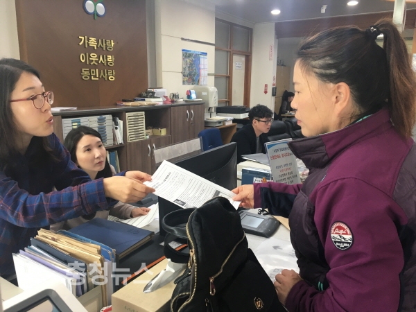 전입 신고하러 온 민원인에게 안내문을 제공하고 있는 모습