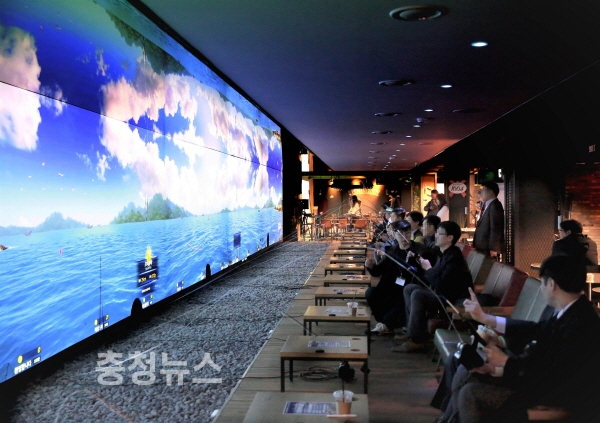 특히 관심을 많이 보였던 스크린낚시 체험은 피싱조이의 가로 22.5m, 세로 2.5m 대형 파노라마형 스크린 화면을 통해 진행되었다.
