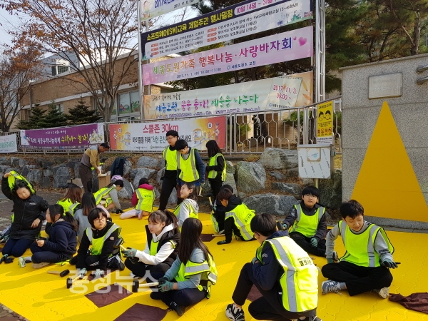 세종시(시장 이춘희)는 8일 어린이 보행안전을 위해 연서면 도원초등학교 앞에 ‘옐로우 카펫’을 설치했다.