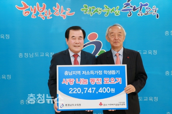 충남도교육청과 충남 사회복지공동모금회는 지난 2005년부터 저소득 가정 학생 돕기 업무제휴 협약을 맺고 ‘사랑 나눔 동전 모으기’를 비롯해 ‘사랑의 수호천사’, ‘희망나눔 캠페인’ 사업 등을 통해 매년 10억여 원의 성금을 저소득가정 학생의 생계비, 의료비, 대학입학 학자금 등으로 지원해왔다.
