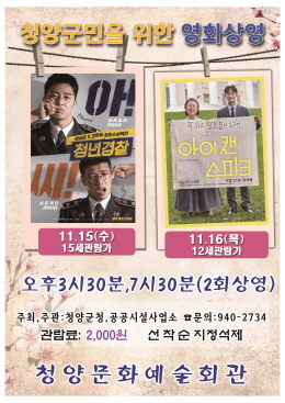 충남 청양군은 겨울의 문턱 11월 가슴 훈훈한 한국영화 2편을 오는 15일과 16일 이틀에 걸쳐 청양문예회관에서 상영한다.