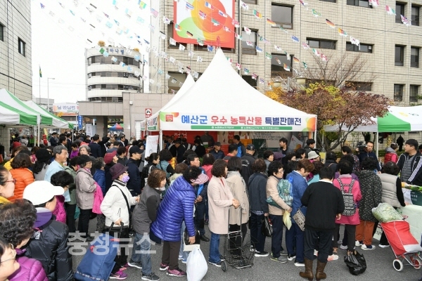 충남 예산군은 10일 농협충남지역본부·예산군지부가 주최·주관한 (구)농협충남지역본부(대전 대사동) 직거래 금요장터에 참여해 우수 농특산물을 저렴하게 판매하는 ‘예산군의 날’ 행사를 실시했다.