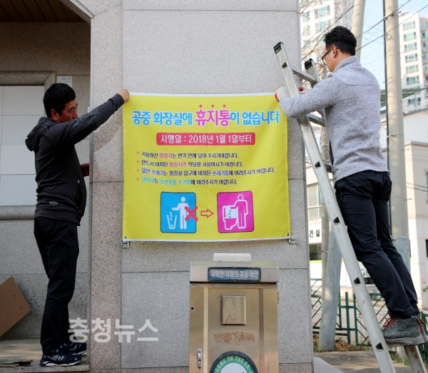 충남 태안군이 공중화장실 대변기 칸 내 휴지통을 제거하고 타 성별 작업자 출입 시 안내표지판을 설치하는 등 ‘깨끗한 선진 화장실’ 만들기에 앞장선다.