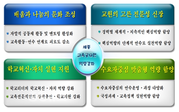 이를 위해 ▲교사경력별 핵심역량 연수의 체계화 ▲교육리더그룹 혁신․실무역량 연수의 특성화 ▲현장 및 수요자중심 직무연수의 다양화 ▲특수분야 연수기관 지정․운영의 유연화 ▲연수 기반 구축을 5대 주요 추진내용으로 삼았다.