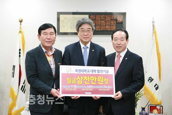 목원대 박노권 총장과 대전 하늘문교회 이기복 감독, (주)카프코 조광휘 대표가 15일 목원대 총장실에서 각각 1000만 원씩 3000만 원의 대학 발전기금을 전달했다.