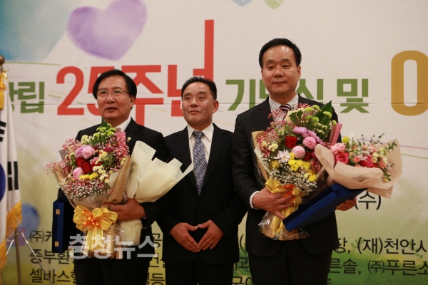 천안시의회 전종한 의장을 비롯하여 복지문화위원회 소속 김각현 위원장, 노희준 의원이 15일 세종웨딩홀에서 열린 (사)충남시각장애인연합회 천안시지회(회장 박재흥) 창립 25주년 기념식 행사에서 우리 지역의 시각장애인 권익신장과 복지증진의 공로를 인정받아 천안시지회로부터 감사패를 받았다.