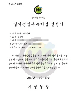 기상청과 한국기상산업기술원이 주관하는 ‘날씨경영우수기업’ 인증제도는 기상정보를 활용해 매출 증가 및 비용 절감, 부가가치 창출, 재해 예방 등의 성과를 거둔 기업을 선정하는 제도이다.