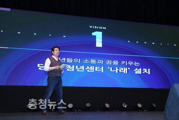 김 시장이 이날 발표한 7대 비전은 ▲당진 청년센터 ‘나래’설치 ▲당진형 청년 뉴딜정책 추진 ▲민간분야 청년 생활임금제 도입 ▲당진청년 종합건강검진 지원 ▲시립 돌봄센터 설치 ▲청년 공유재단 설립 ▲당진시 청년민회 구성이다.
