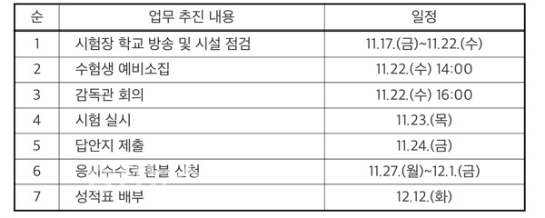 시교육청은 교육부에서 발표한 수능 관련 모든 일정과 절차대로 철저히 준비해 일정에 따라 차질없이 시험관리를 수행할 계획이다.