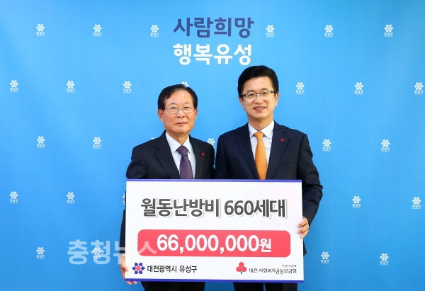 대전 유성구(구청장 허태정)는 17일 구청 행복사랑방에서 대전사회복지공동모금회(회장 안기호)로부터 따뜻한 겨울나기 지원사업의 일환으로 동절기 저소득층 가정을 위한 월동난방비 전달식을 가졌다고 밝혔다.