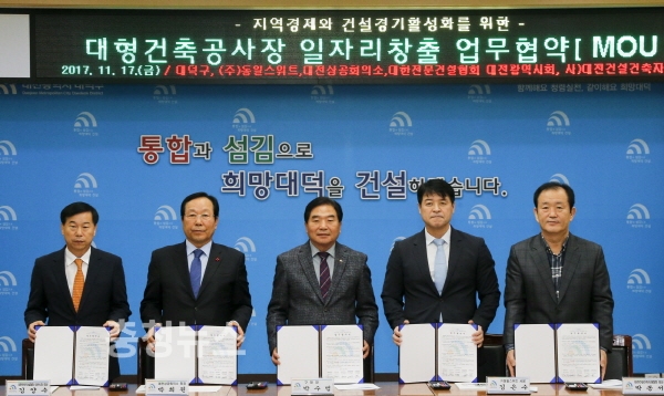대전 대덕구(구청장 박수범)는 지난 17일 구청 중회의실에서 대형건설업체인 ㈜동일스위트(사장 김은수) 등 4곳과 손을 잡고 지역경제 살리기와 대형건축공사장 일자리 창출을 위한 업무협약(MOU)을 체결했다.